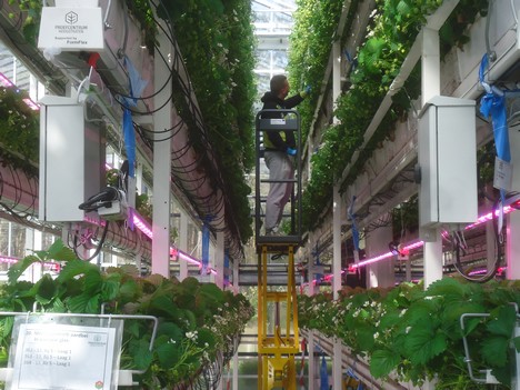 Medewerker aan het plukken in de meerlagenteelt bij GLITCH in het Proefcentrum Hoogstraten ©GLITCH