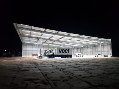 Voet Verhuur in Culemborg is specialist in aggregaten voor tijdelijke noodstroominstallaties en synchrone netovernames. Hun specialisten staan dag en nacht klaar, op elke gewenste locatie, voor iedere klant met service en logistiek. Voet groeit snel. Daarom heeft ze op haar locatie te Culemborg een nieuwe overkapping gerealiseerd voor de tijdelijke opslag van materieel.
